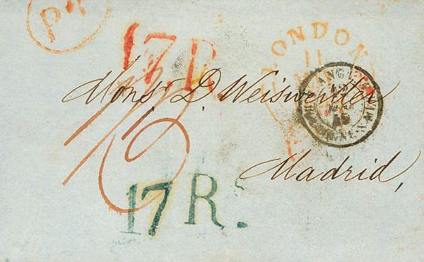 1850. LONDON to MADRID. Double arch mark LONDON PAID, handwritten postage 1/3 (prepaid) and double Spanish postage (in red and blue-green), on arrival "15 R" (reales), applied in Irún and Madrid. MAGNIFICENT.