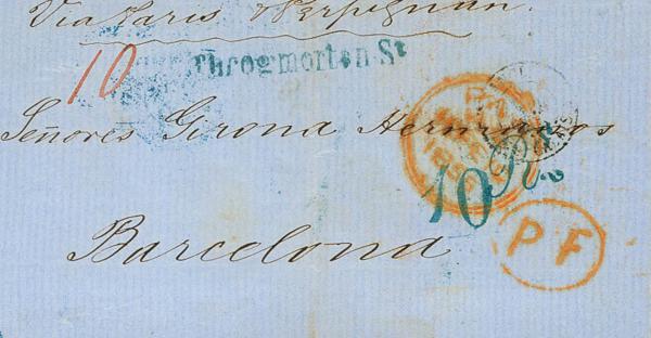 1856. LONDON to BARCELONA, circulated via Paris and Perpignan. Handwritten portage "1/3" (prepaid) and "8 Rs" (reales) applied in Spain. MAGNIFICENT.