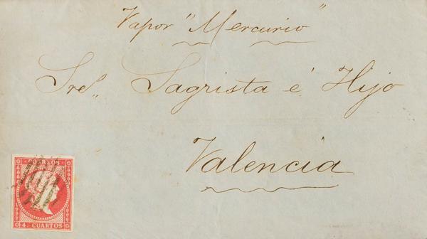 Yvert 20. 1857. 1 green sh (small defect in the upper left corner). LONDON to CADIZ, circulated via France. Appraised on arrival with "8 R" (reales), transit and arrival daters on the back and MP mark, in blue. PRETTY.
