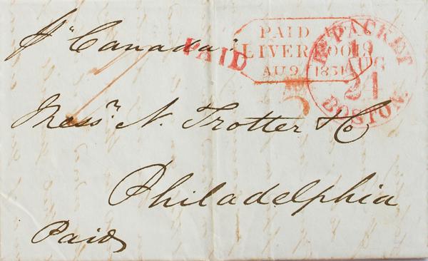 1851. LIVERPOOL to PHILADELPHIA. PAID AT / LIVERPOOL mark and B. PACKET / BOSTON dater, both in red. MAGNIFICENT.