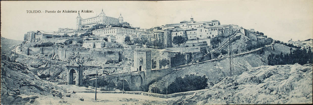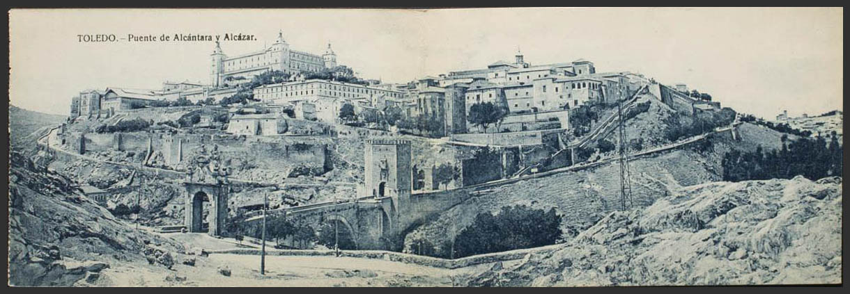 TOLEDO. Alcántara Bridge and Alcázar. Double postcard.