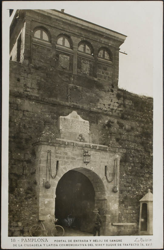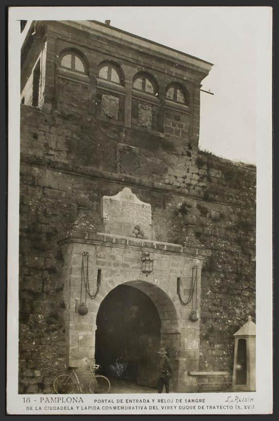 PAMPLONA. Entrance portal and Blood Clock of the Citadel and commemorative tombstone of the Viceroy Duke of Trayecto.