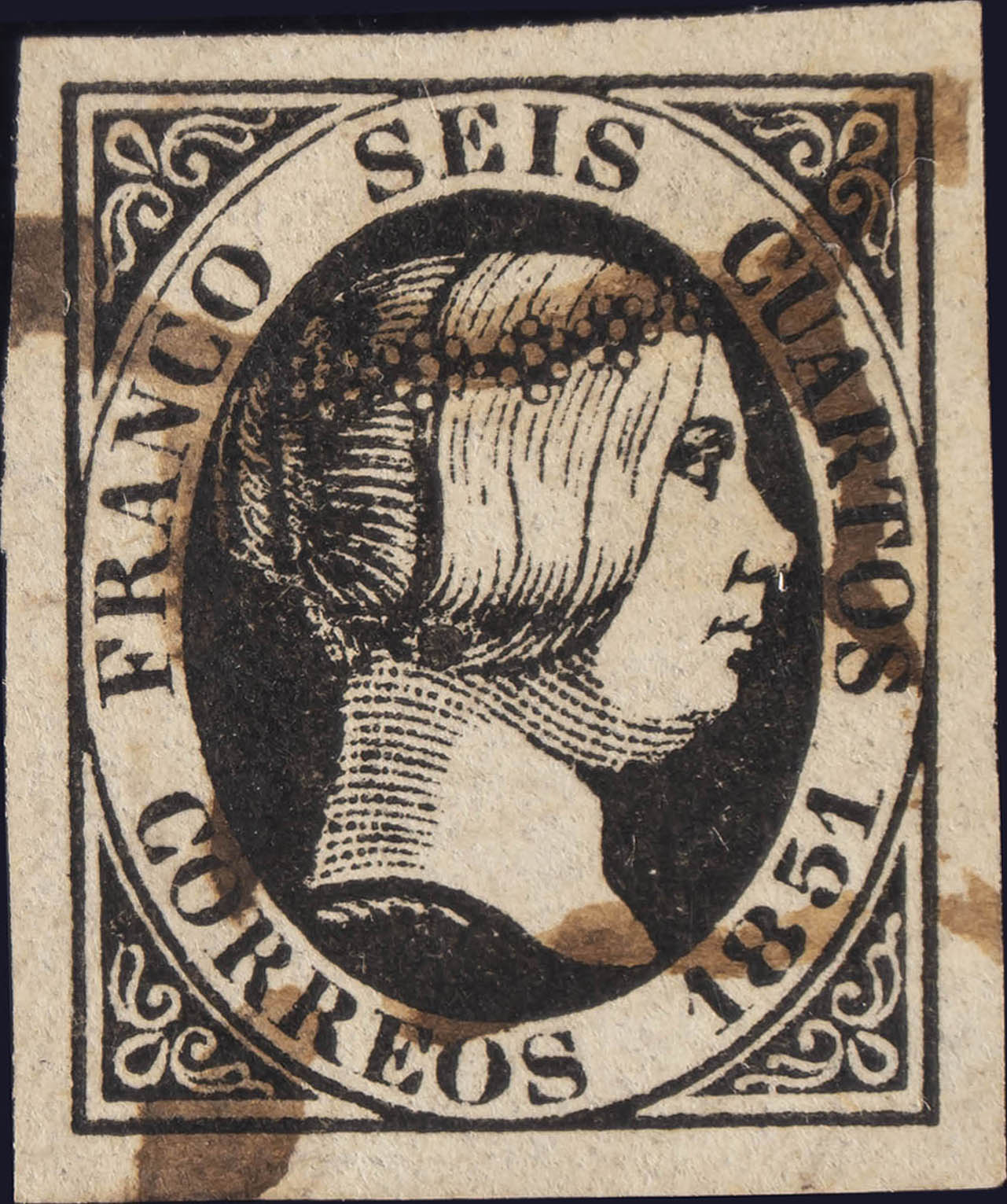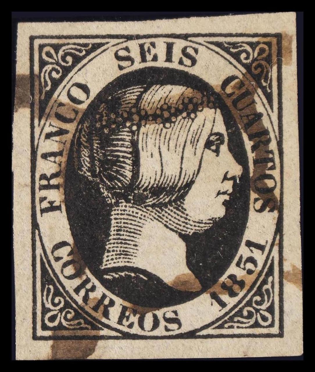 6. 1851. 6 cuartos negro. Matasello ARAÑA, en tinta de escribir. PIEZA DE LUJO.