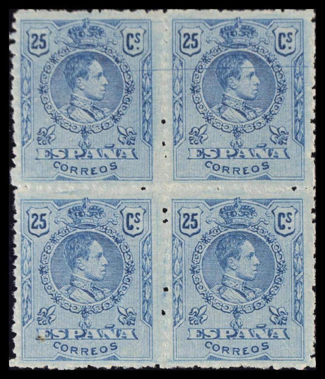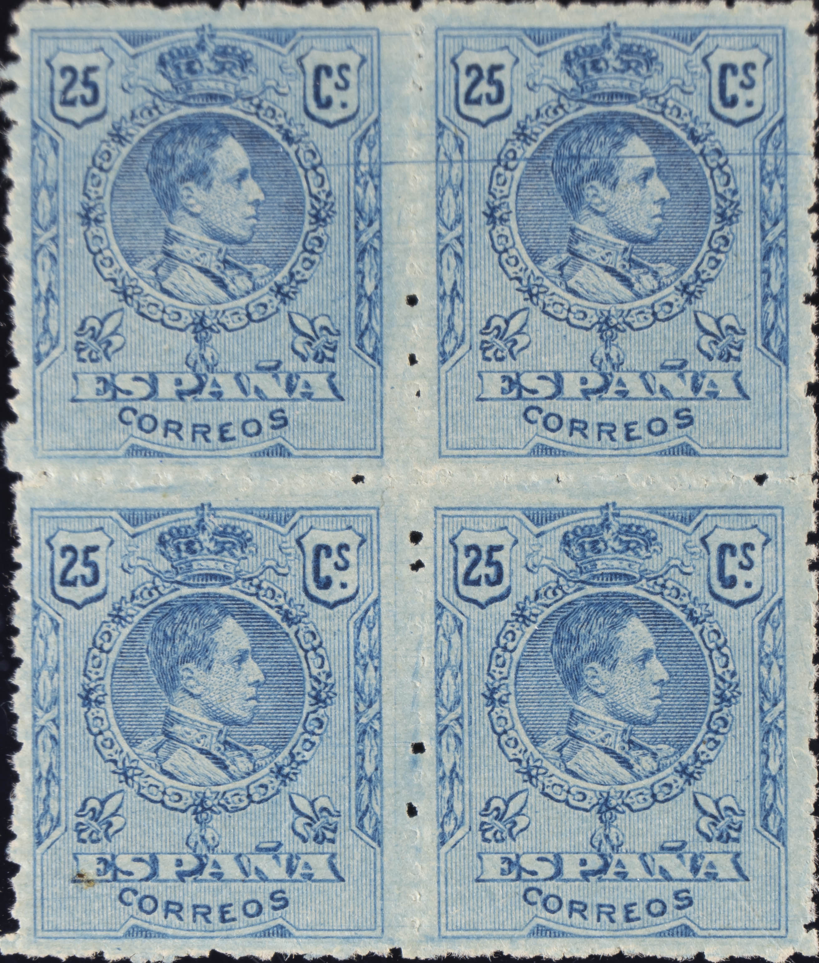 ★★ 274. 1909. 25 cts azul, bloque de cuatro. MAGNIFICO.