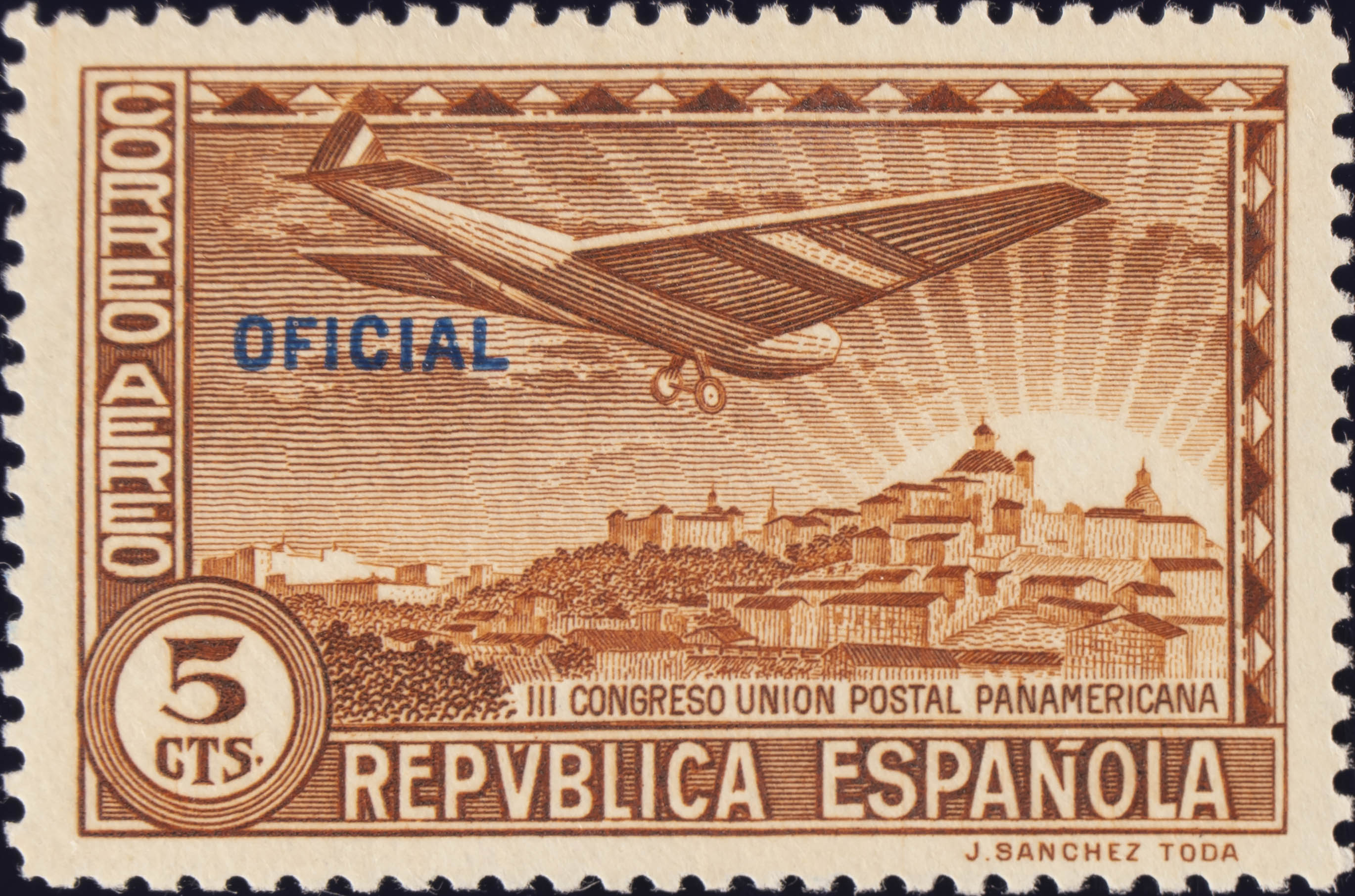 ★ 630hcc. 1931. 5 cts castaño amarillo. CAMBIO DE COLOR EN LA SOBRECARGA, en azul. MAGNIFICO. Edifil 2015: 34 Euros