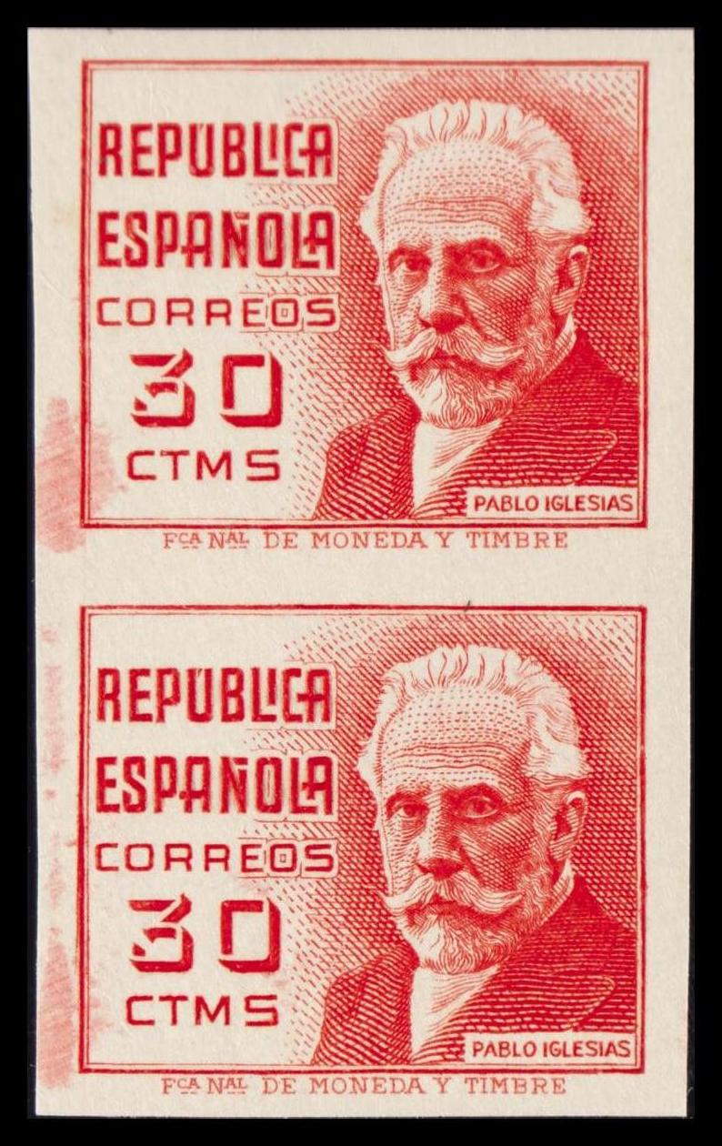 ★★/★ 735s(2). 1937. 30 cts rosa, pareja (un sello sin fijasellos). SIN DENTAR. MAGNIFICA. Edifil 2020: +48 Euros