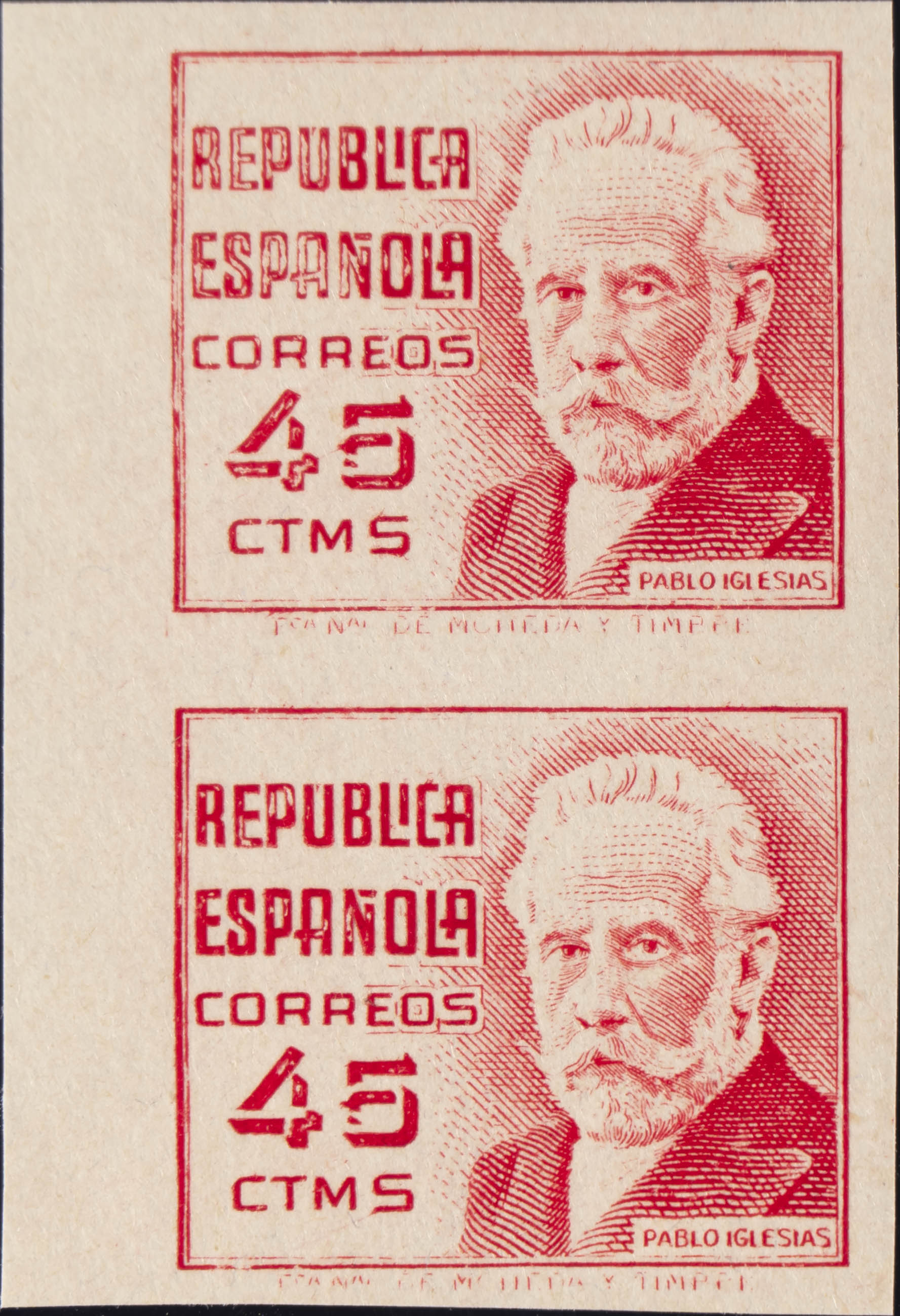 ★★/★ 737s(2). 1937. 45 cts carmín, pareja (un sello sin fijasellos). SIN DENTAR. MAGNIFICA. Edifil 2020: +49 Euros