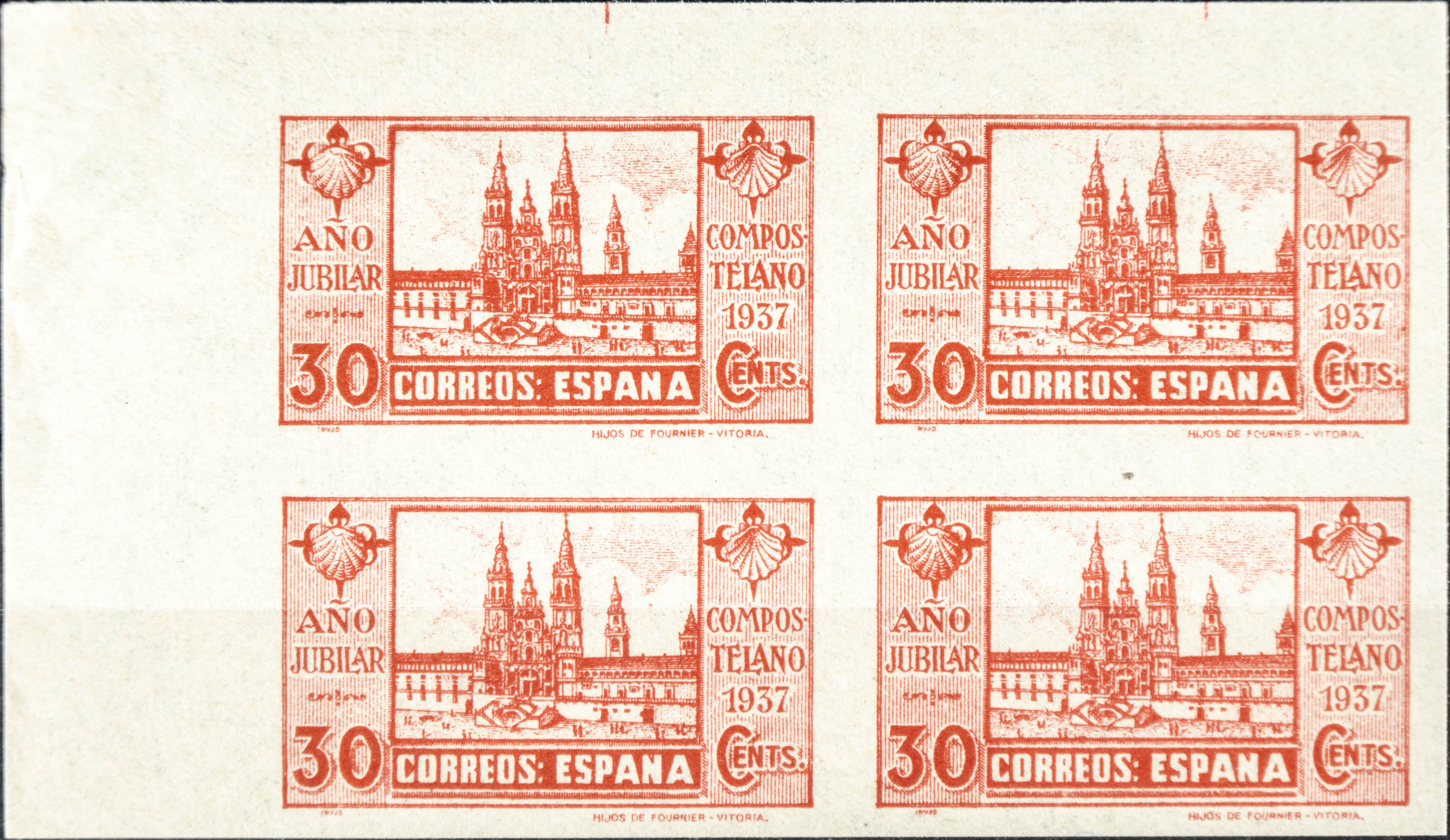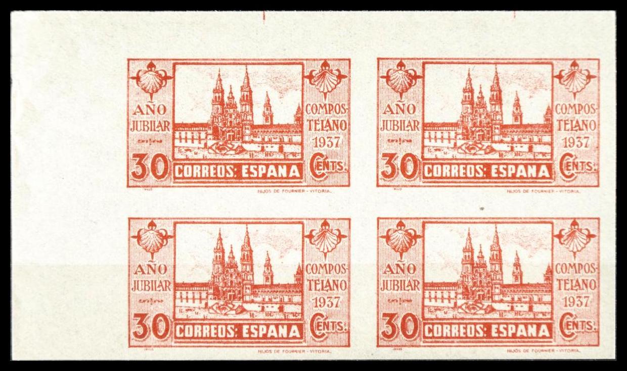 ★★ 834s(4). 1937. 30 cts carmÃn, bloque de cuatro, esquina de pliego. SIN DENTAR. MAGNIFICO. Edifil 2020: +116 Euros
