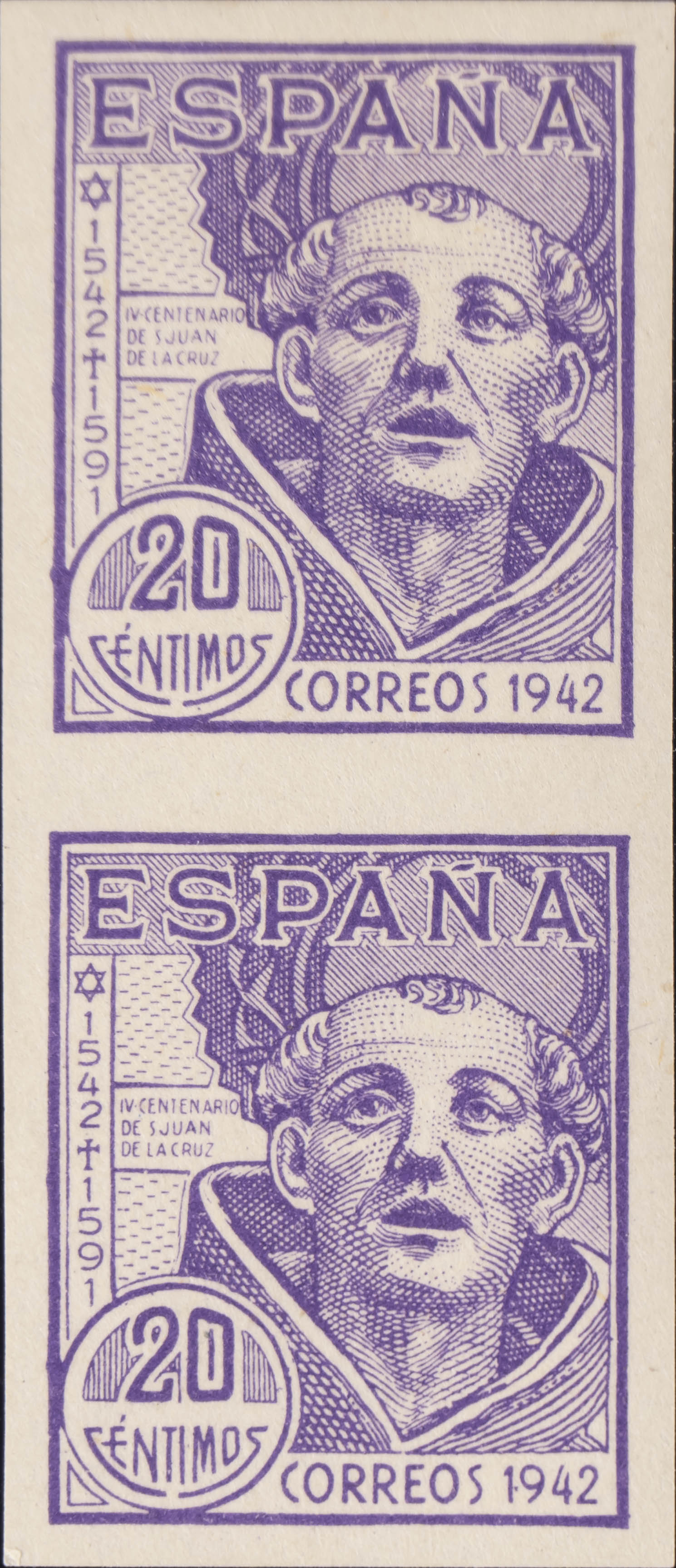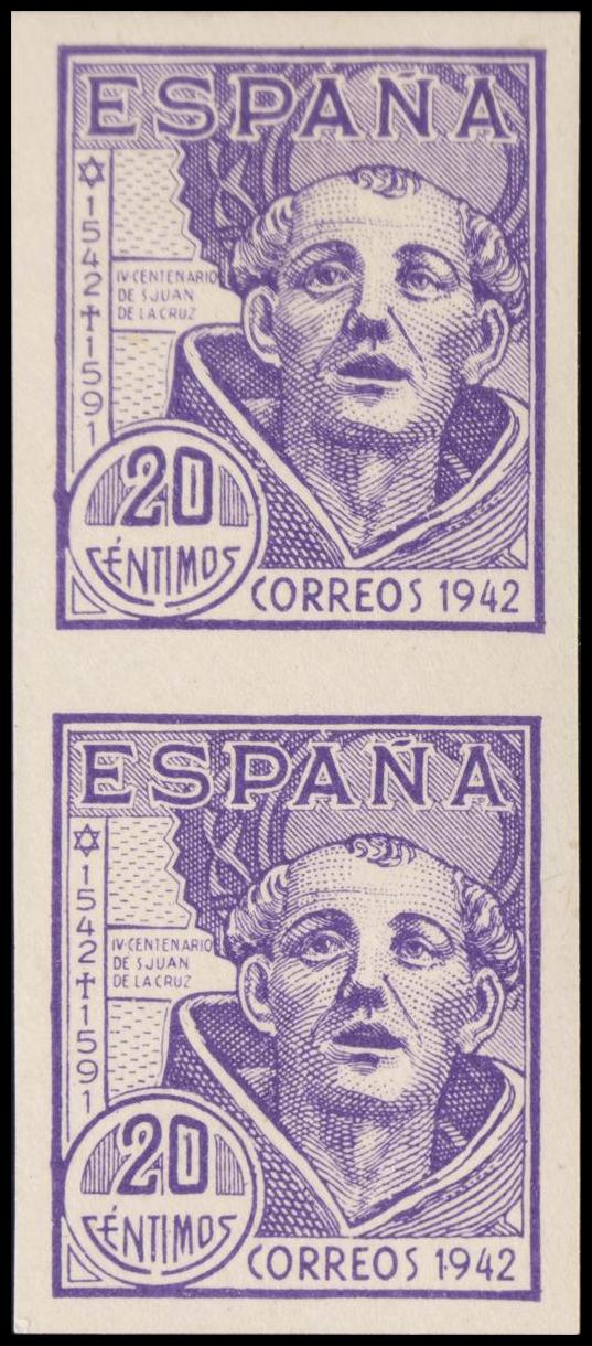 ★★/★ 954s(2). 1942. 20 cts violeta, pareja. SIN DENTAR. MAGNIFICA. Edifil 2015: +75 Euros