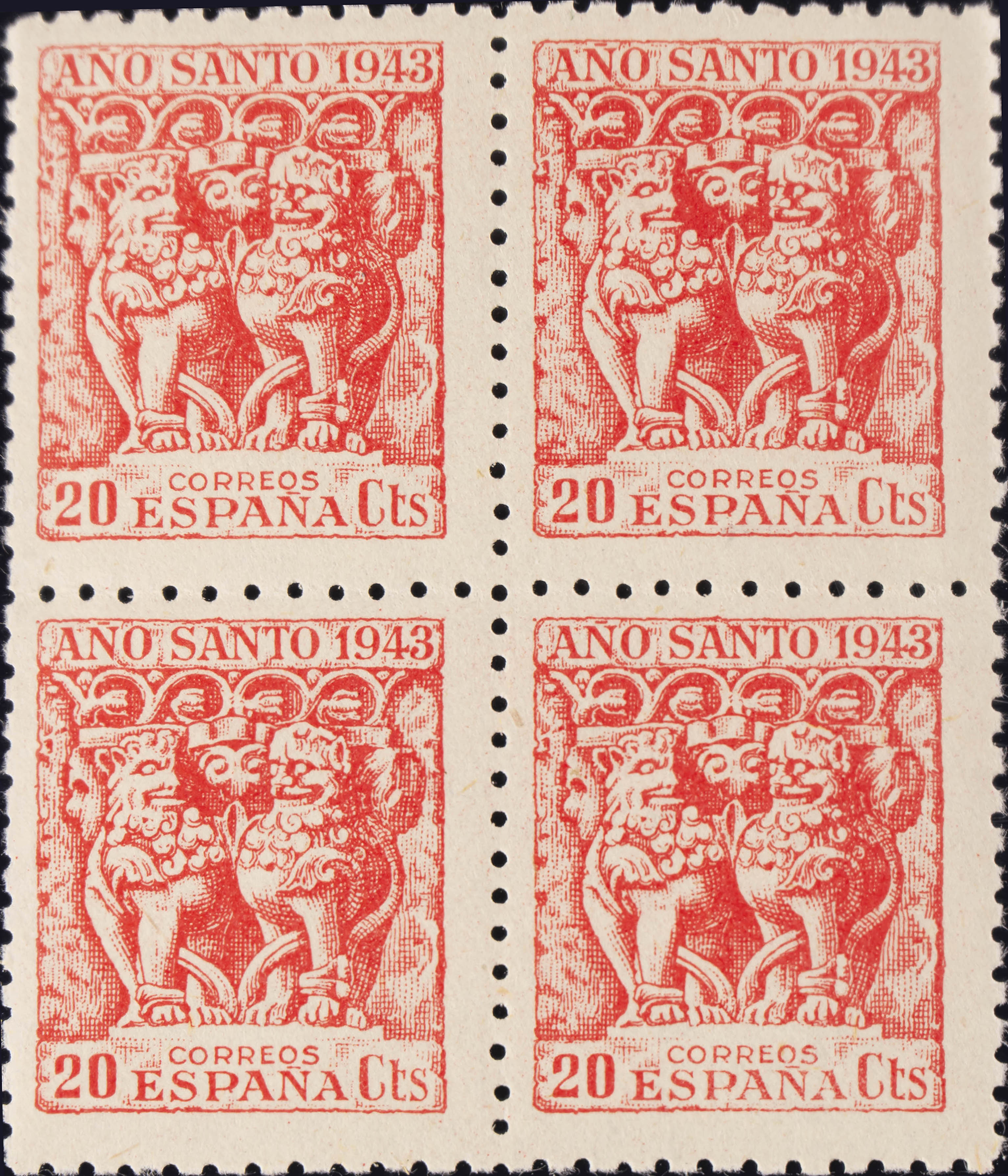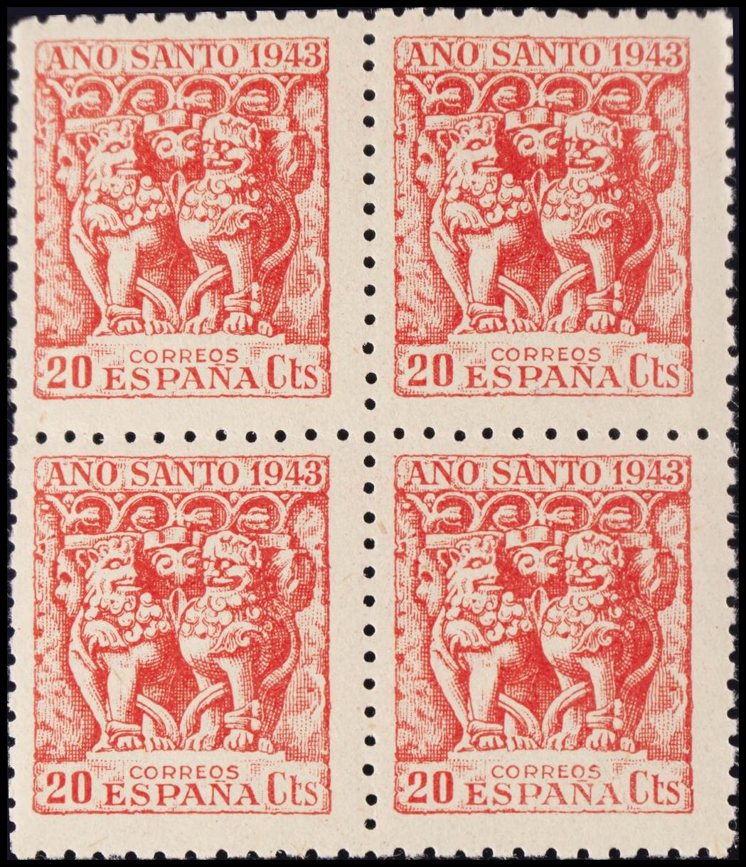 ★★ 964(4). 1944. 20 cts rojo, bloque de cuatro. MAGNIFICO.