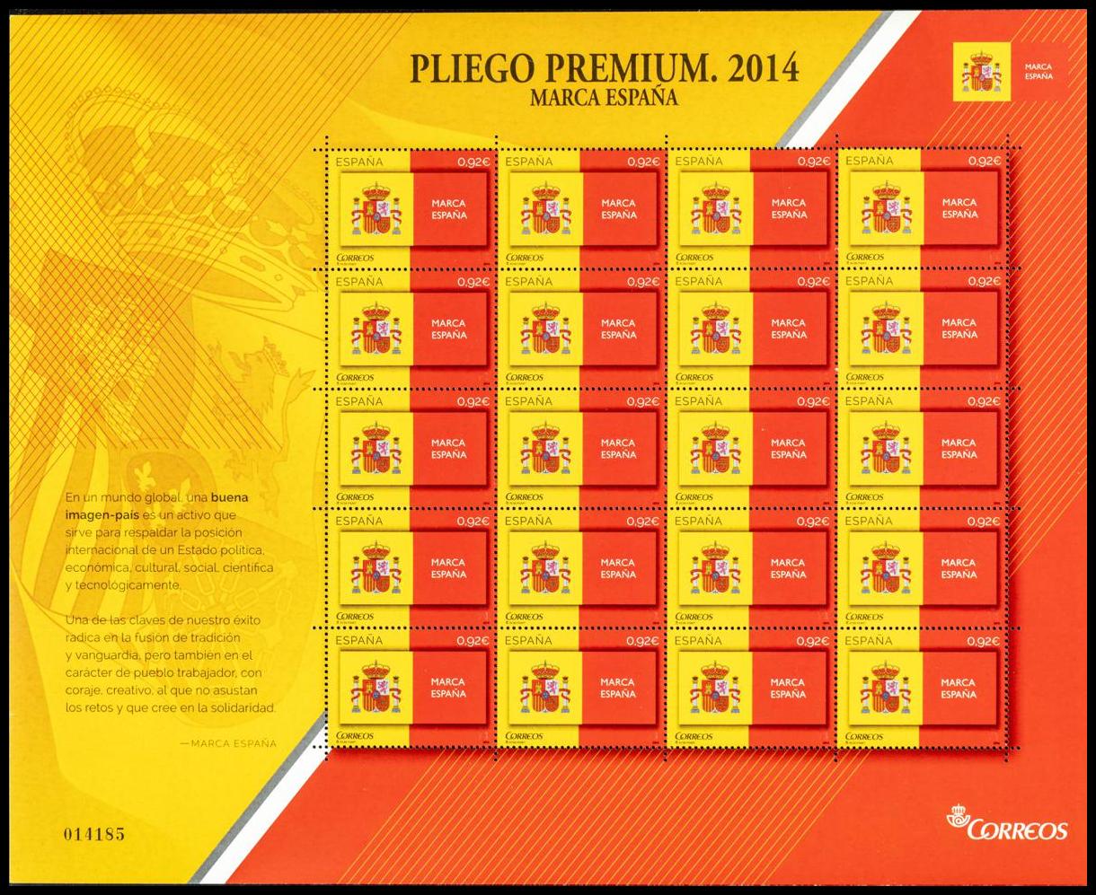 ★★ MPP4. 2014. 0.92 Euros, multicolour. Premium mini-sheet of twenty stamps. SPANISH MARK. MAGNIFICENT. Edifil 2020: 40 Euros
