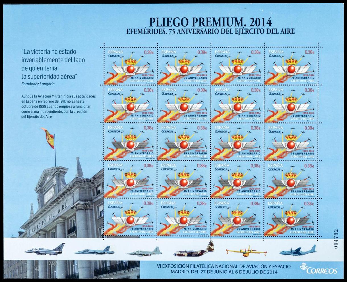 ★★ MPP13. 2014. 0.38 Euros, multicolour. Premium mini-sheet of twenty stamps. 75th Anniversary of the Air Force. Magnificent. Edifil 2020: 25 Euros