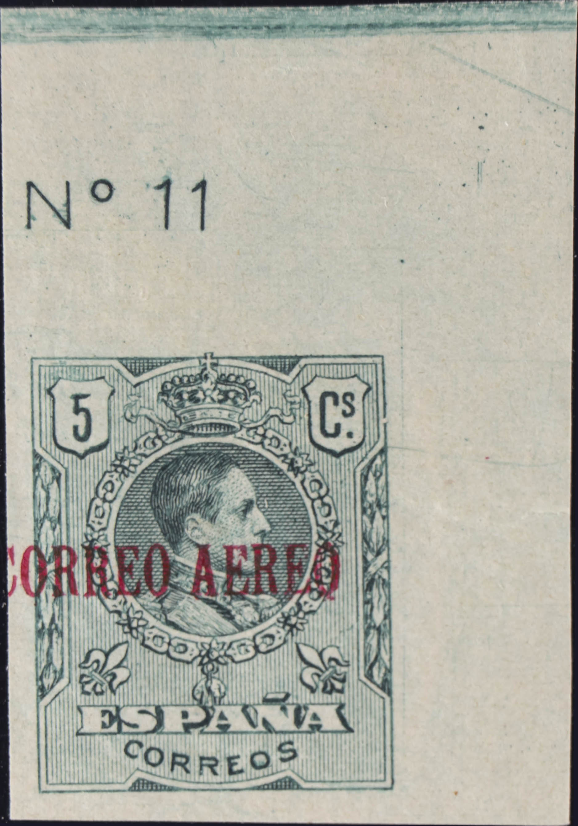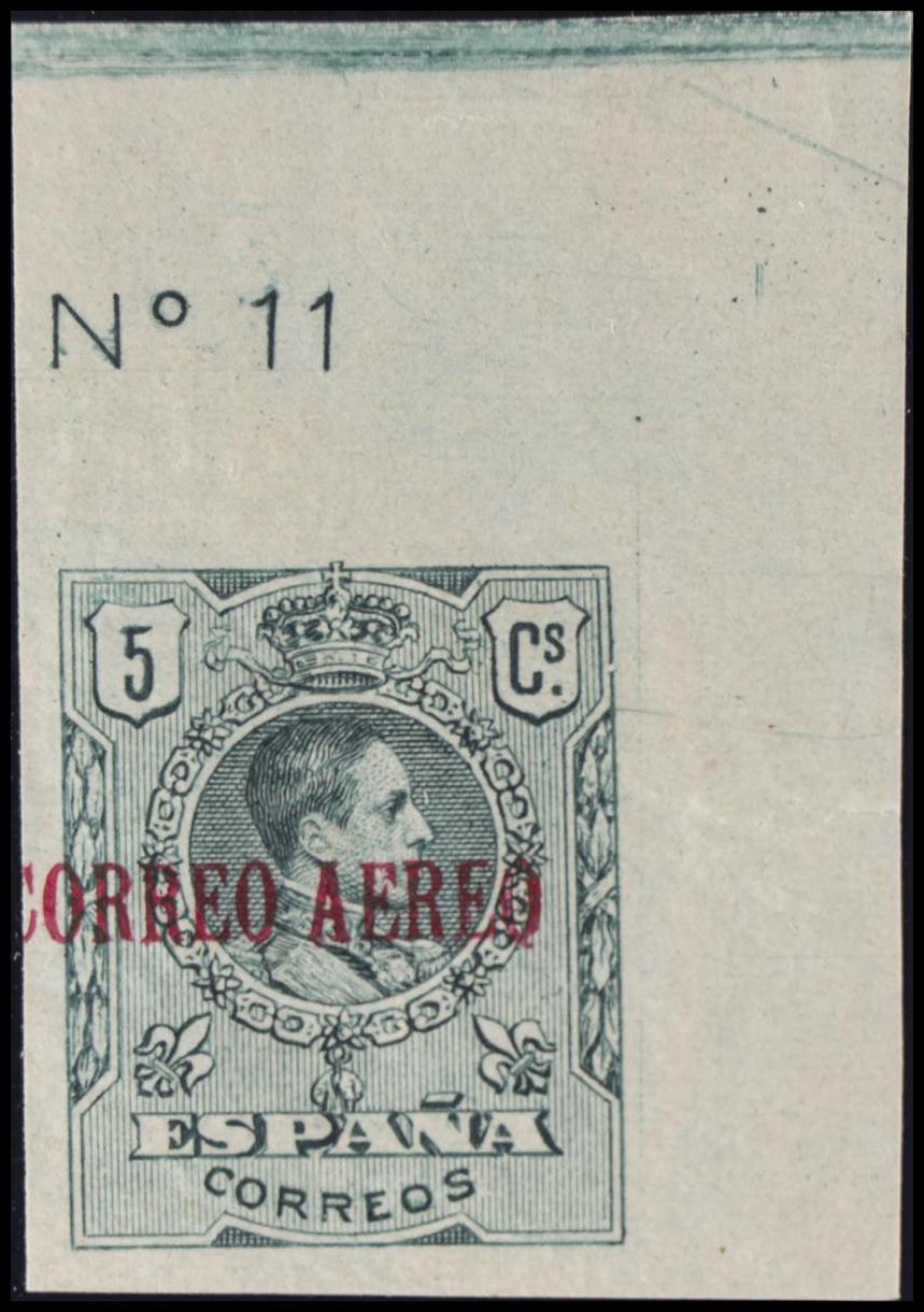 ★ 292s. 1920. 5 cts verde, esquina de pliego con número. SIN DENTAR. MAGNIFICO. Edifil 2022: +104 Euros