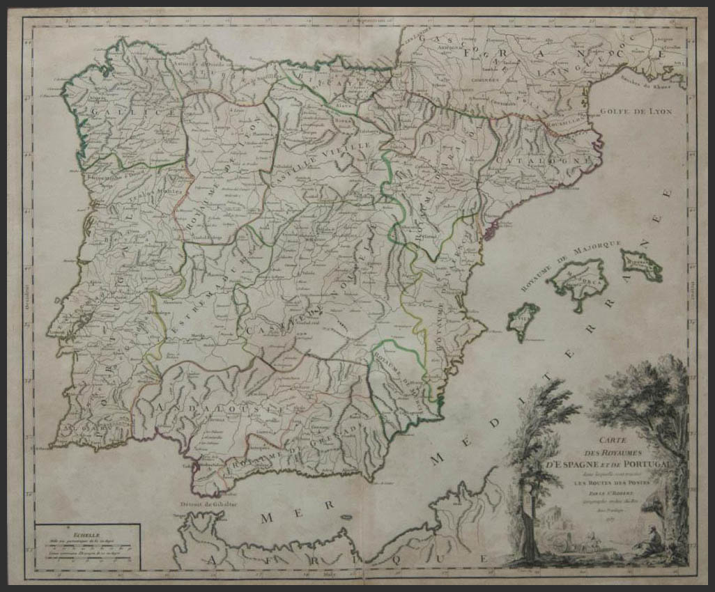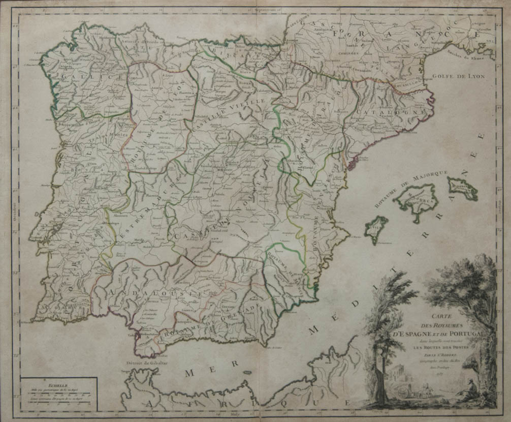 1757. Postal Route Map: THE ROUTES OF THE POSTAL ROUTES OF SPAIN AND PORTUGAL. Paris, 1757. Robert de Vaugondy. Magnificent and very rare, this is the first map of the postal routes of the Iberian Peninsula.