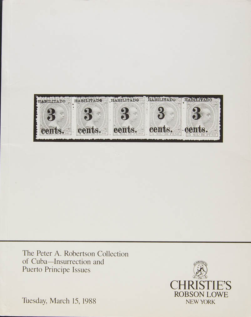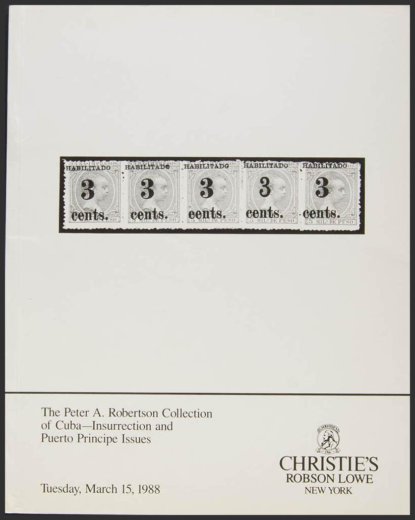 1988. THE PETER A. ROBERTSON COLLECTION OF CUBA INSURRECTION AND PORT-AU-PRINCE ISSUES. Christie's and Robson Lowe. New York, 1988. (without a doubt the finest collection ever assembled of the Cuban Insurrections and Port-au-Prince issues, with countless high-quality photographs).