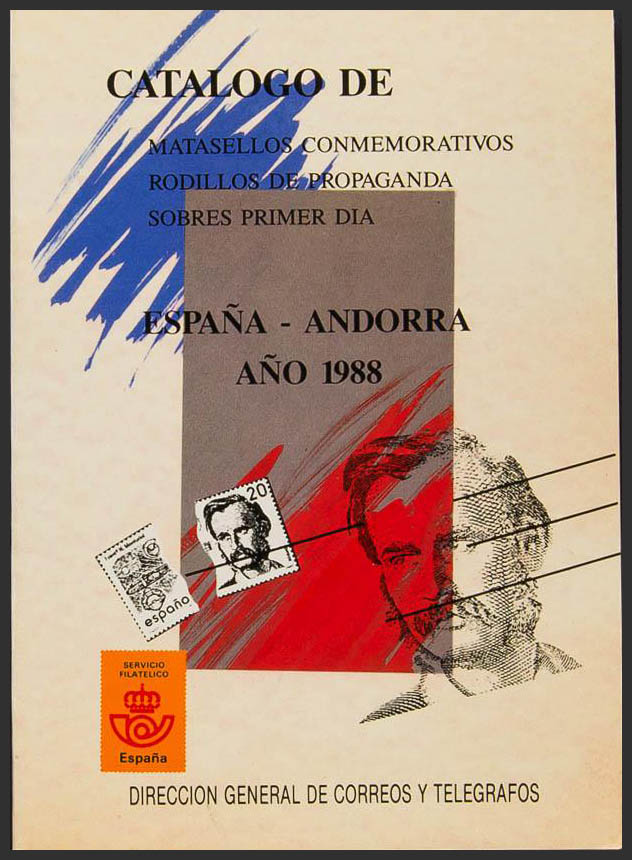 1989. SPAIN-ANDORRA YEAR 1988, CATALOG OF COMMEMORATIVE POSTMARKS, PROPAGANDA ROLLS, AND FIRST-DAY COVERS. General Postal Directorate. Madrid, 1989.