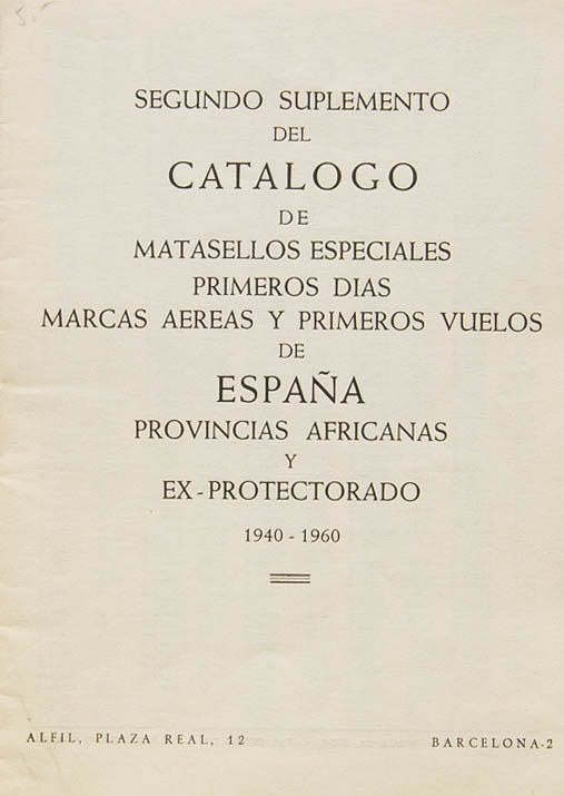 1960. Second Supplement to the Catalogue of Special Postmarks: First Days, Air Markings, and First Flights of Spain, African Provinces, and Former Protectorates 1940-1960. Alert Riba. Barcelona, 1960.