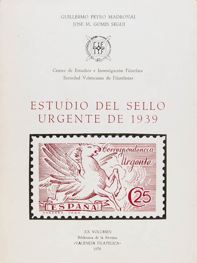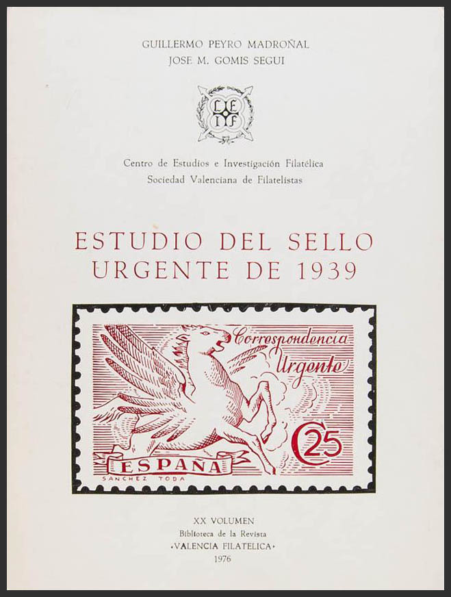 1976. STUDY OF THE URGENT STAMP OF 1939. Guillermo Peyró Madroñal and José MarÃa GomÃs SeguÃ. 20th Volume of the Library of the "Valencia Filatélica" Magazine, 1976.