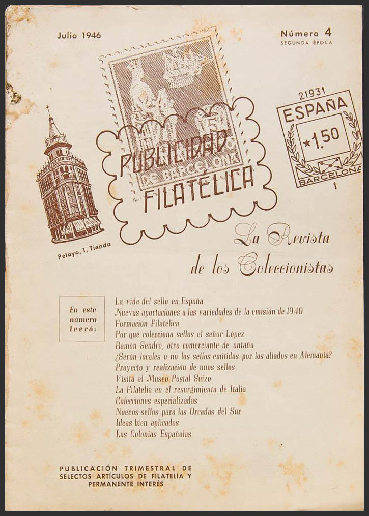 (1946ca). Set of twelve PUBLICIDAD FILATELICA magazines published between July 1946 and September 1949, corresponding to issues 4, 6, 7, 8, 9, 10, 11, 12, 13 (two issues), 15 and 16. Barcelona, 1946-49. (some rust spots)