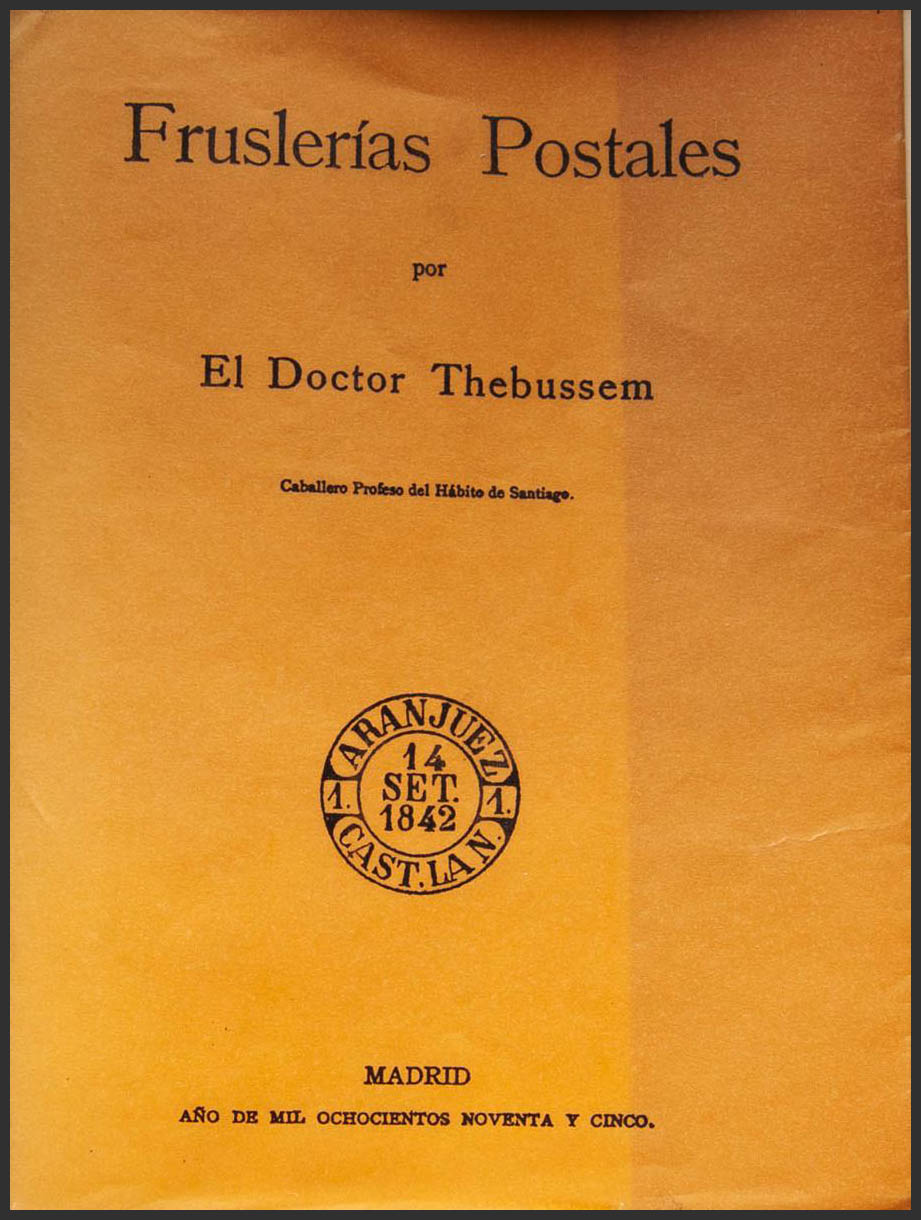 English (1980ca). A set of six books, four of them works by Dr. Thebussem: PHILATELIC LETTERS, A SHEET OF LETTERS, POSTAL TRIFLES, and SOME PHILATELY; the other two volumes: HISTORY OF THE MAIL, by Eduardo Verdegay, and ORDINANCE OF THE MAIL, POST OFFICES, ROADS, AND OTHER BRANCHES. (All are reprints from the 1980s.)