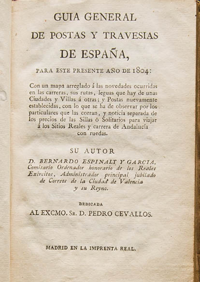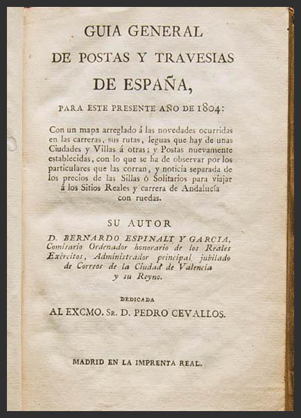 1804. GENERAL GUIDE TO POST AND TRAVELS IN SPAIN. By Bernardo Espinalt. Madrid, 1804. A MAGNIFICENT AND RARE WORK, WHICH INCLUDES THE ORIGINAL MAP OF THE POST ROADS.