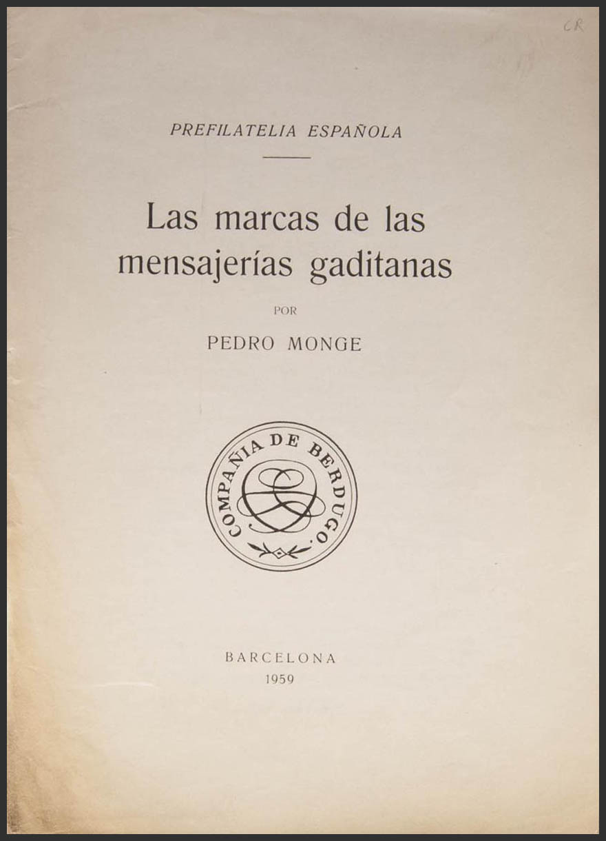 1959. SPANISH PRE-PHILATELY: THE MARKS OF CADITAN MAILERS. Pedro Monge. Barcelona, 1959.