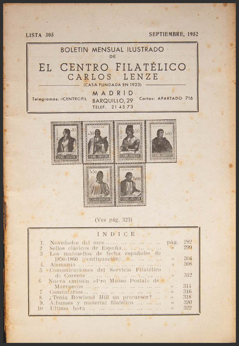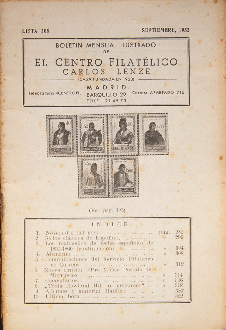 (1952ca). Set of issues of the CENTROFIL BULLETIN (MONTHLY ILLUSTRATED PHILATELIC PROPAGANDA PUBLICATION), corresponding to issues 305, 309, 311, 312, 313, 314 and 320. Madrid, 1952ca. (some rust stains).