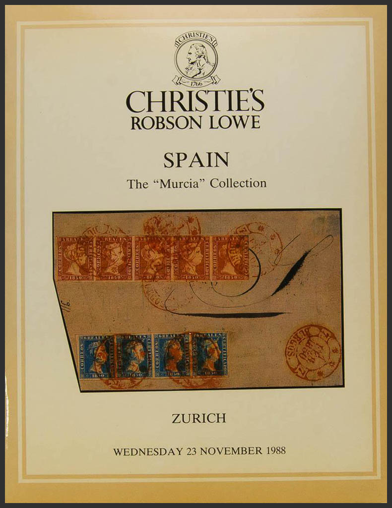 1988. Catalogue of the auction of THE "MUGoodIA" CLASSIC SPANISH COLLECTION, held in Zurich on 23 November 1988. Christie's and Robson Lowe. (Includes many iconic pieces of Spanish philately.)