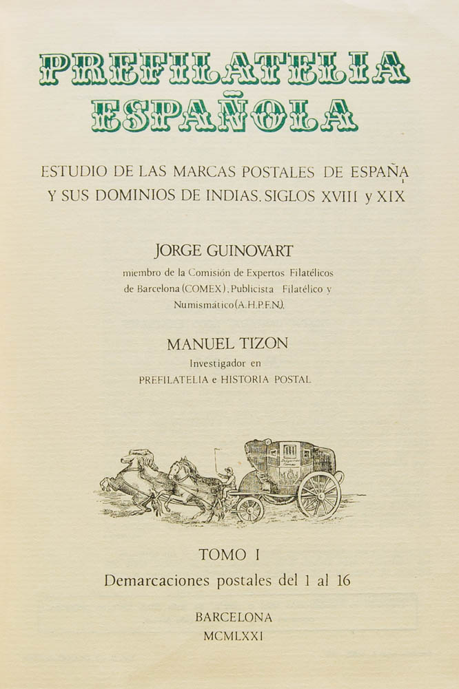 1971. SPANISH PREPHILATELY, A STUDY OF THE POSTAL MARKS OF SPAIN AND ITS DOMINIONS IN THE INDIES, 18TH AND 19TH CENTURIES, two volumes. Jorge Guinovart and Manuel Tizón. 1971 edition.