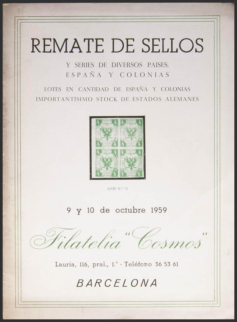 1959. Catalogue of the Philatelic auction organized by Cosmos on October 9 and 10, 1959. Barcelona, 1959.