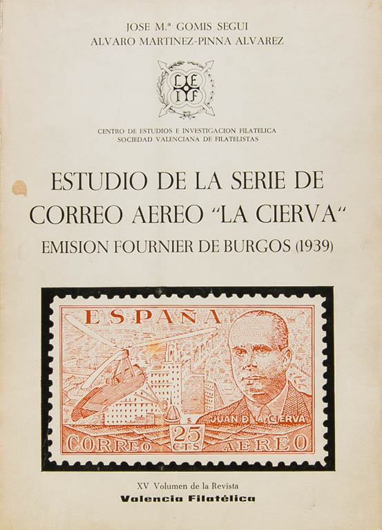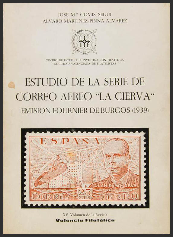 1970. STUDY OF THE AIR MAIL SERIES "LA CIERVA" FOURNIER ISSUE OF BURGOS (1939). José MarÃa Gomis Seguà and Alvaro MartÃnez-Pinna. XV Volume of the Valencia Philatelic Magazine. Valencia, 1970.