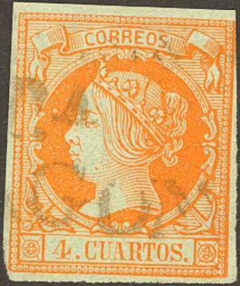 52(4). 1860. 4 orange cuartos , block of four. Postmark VALDERROBRES / TERUEL. MAGNIFICENT AND VERY RARE, ACCORDING TO LAIZ IT IS THE RAREEST TYPE II DATER IN THE PROVINCE OF TERUEL.