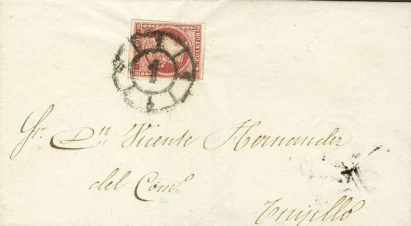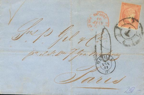 48. 1859. 4 red cuartos . SEVILLE to PARIS (FRANCE). Postmark R.CARRETA Nº7 and on the front portage "10" handwritten (double postage), according to the Agreement with France of April 1, 1849, prior postage was not necessary for ordinary correspondence and as of August 1859, in case if it was franked, it was considered that it paid the transit only up to the border. MAGNIFICENT AND RARE DOUBLE PORTION.
