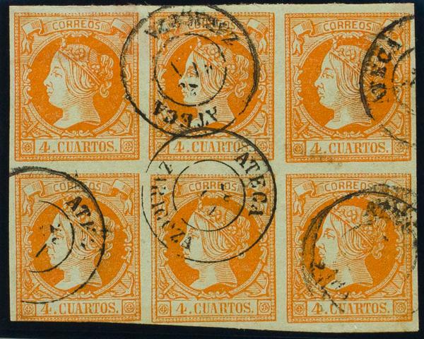 52(6). 1860. 4 orange cuartos , block of six. Postmark ATECA / ZARAGOZA. MAGNIFICENT.