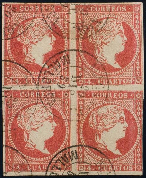 48(4). 1856. 4 red cuartos , block of four. Postmark MACANOR / MALLORCA, instead of MANACOR. MAGNIFICENT AND RARE.