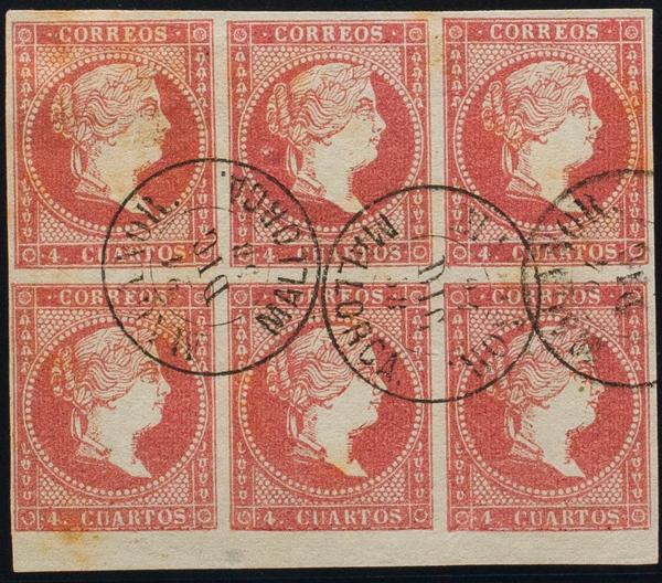 48(6). 1856. 4 red cuartos , block of six, sheet edge. Postmark MACANOR / MALLORCA, instead of MANACOR. MAGNIFICENT AND RARE.