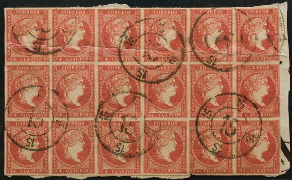 △ 48(18). 1859. 4 cuartos red, block of eighteen, on fragment (fold, minor, affecting upper stamps). Postmark R. CARRETA Nº15, from Zaragoza. MAGNIFICENT.
