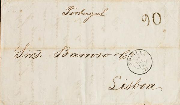 1859. SEVILLE to LISBON. Dater SEVILLA / (7) and porterage "90" applied at destination, postage with stamps to Portugal was not yet necessary, as there was no agreement. MAGNIFICENT.