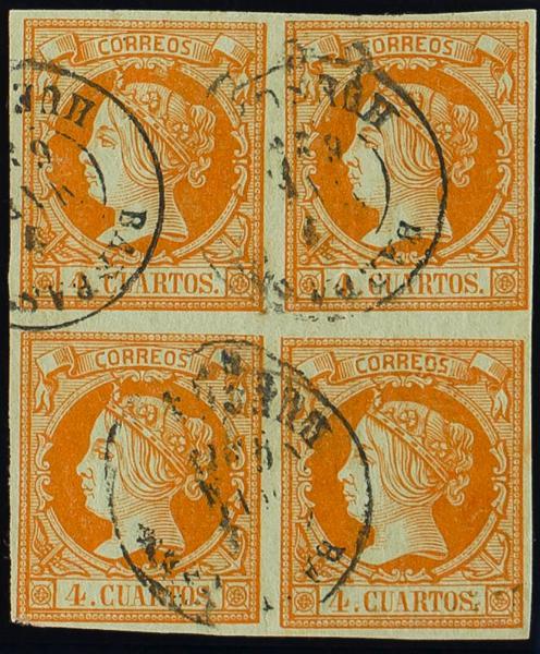 52(4). 1860. 4 orange cuartos , block of four. Postmark BARBASTRO / HUESCA (Type I). MAGNIFICENT AND VERY RARE.