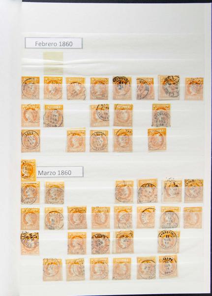 52(800). 1860. Advanced reconstruction project of the calendar of the 4 orange cuartos of 1860, with eight hundred daters with different days (with different qualities) of the eight hundred and ninety-six days in which this stamp circulated. MAGNIFICENT AND RARE SET.