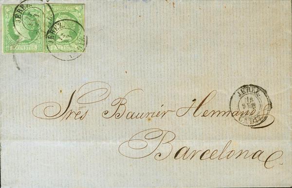 51(2). 1861. 2 green cuartos , two stamps. SHERRY to BARCELONA. Postmark JEREZ / CADIZ. RARE COMBINATION TO COMPOSE THE 4 ROOMS. MAGNIFICENT.
