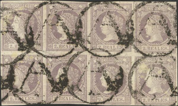 56(8). 1860. 2 lilac reales , block of eight. Postmark "A" of Infantes. MAGNIFICENT AND RARE.