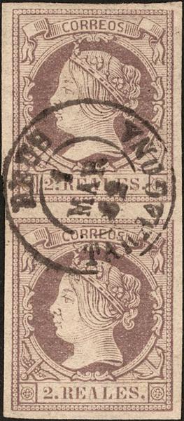 56(2). 1860. 2 lilac reales , vertical pair. Postmark REUS / TARRAGONA. MAGNIFICENT.