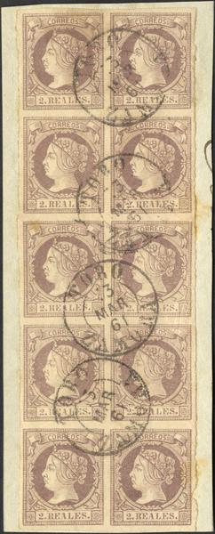 △ 56(10). 1860. 2 lilac reales , block of ten stamps, on fragment. TORO / ZAMORA postmark. MAGNIFICENT AND RARE.