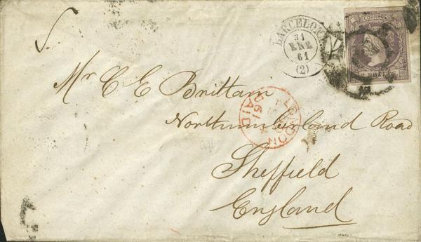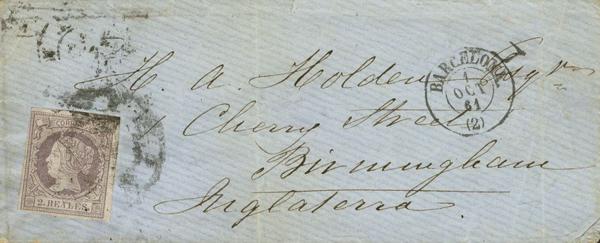 56. 1861. 2 lilac reales . BARCELONA to ENGLAND. MAGNIFICENT.