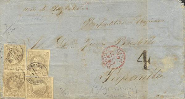 53(4). 1860. 12 carmine cuartos , four stamps. MADRID to SANTA MARIA DE OLORON (FRANCE). MAGNIFICENT AND RARE FOUR POSTAGE POSTAGE, SPECTACULAR.