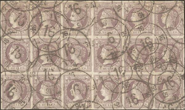 56(18). 1860. 2 reales lilac, block of eighteen. Postmark R. CARRETA Nº16. MAGNIFICENT AND UNUSUAL AT THIS SIZE. Building 2009: Edifil Euros