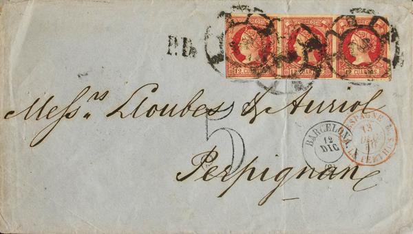 53(5). 1861. 12 carmine cuartos , five stamps. BARCELONA to MARSEILLE (FRANCE). MAGNIFICENT AND VERY RARE FIVE POSTAGE POSTAGE TO FRANCE.