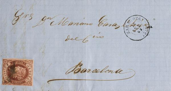 58. 1862. 4- cuartos chestnut. ZARAGOZA to BARCELONA. MAGNIFICENT AND EXTREMELY RARE LETTER CIRCULATED ON THE 1ST DAY OF ISSUE 16-JUL-1862.