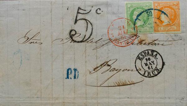51, 52. 1861. 2 cuartos green and 4 cuartos orange. IRUN (GUIPUZCOA) to BAYONA (FRANCE). Postmark R. CARRETA Nº50, in blue. MAGNIFICENT AND RARE BORDER POSTAGE.